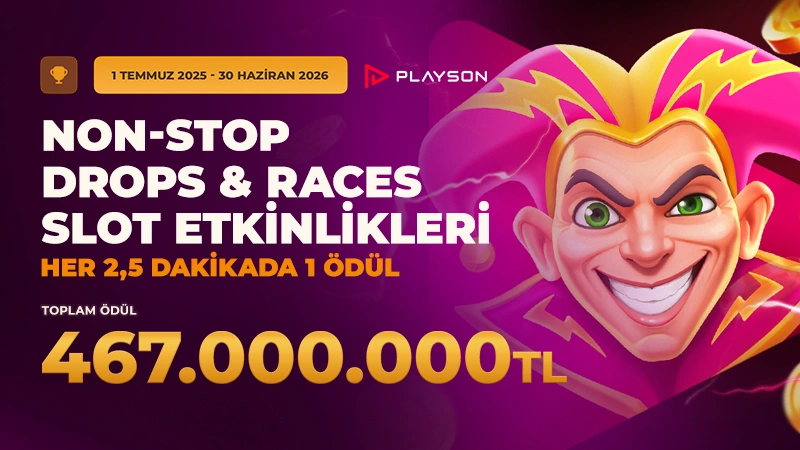 ✩ Playson Non-Stop Drops & Races Slot Etkinlikleri'nde 1 Temmuz 2026’ya kadar her ay 3 ayrı etkinlik gerçekleştirilecektir: Ek olarak yılda 4 kez CashDays X-TREME VIP turnuvaları düzenlenecektir.
